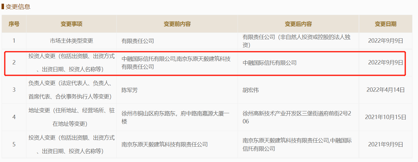 据乐居财经查阅,转让前,徐州绿水置业有限公司由南京东原天毅建筑科技有限责任公司持股51%,由中融国际信托有限公司持股49%;转让后,徐州绿水置业有限公司由中融国际信托有限公司持股100%。
