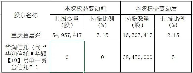 若本次转让完成后,重庆金嘉兴持有陕西金叶的股份将从原来的7.15%降至2.15%,华润信托(代“华润信托?华颖【19】号单一资金信托”)持股比例将升至5%。