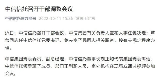 10月11日,“中信信托官方账号”发布消息称,近日,中信信托召开干部会议,中信集团有关负责人宣布人事任免决定:芦苇同志任中信信托党委书记,免去李子民同志相关职务,按有关规定程序办理。