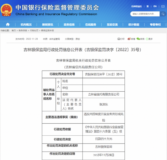 11月28日,银保监会官网披露吉银保监罚决字〔2022〕35号处罚信息表显示,吉林信托存在“违反内控制度开展业务并形成风险”违规行为,被处以罚款40万元。
