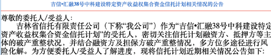 据吉林信托此前公告显示,公司作为吉信·汇融38信托计划的受托人,密切关注信托计划融资方、抵押方等主体的破产重整状况,并结合融资方及担保方破产重整情况,多方位多途径进行风险化解。