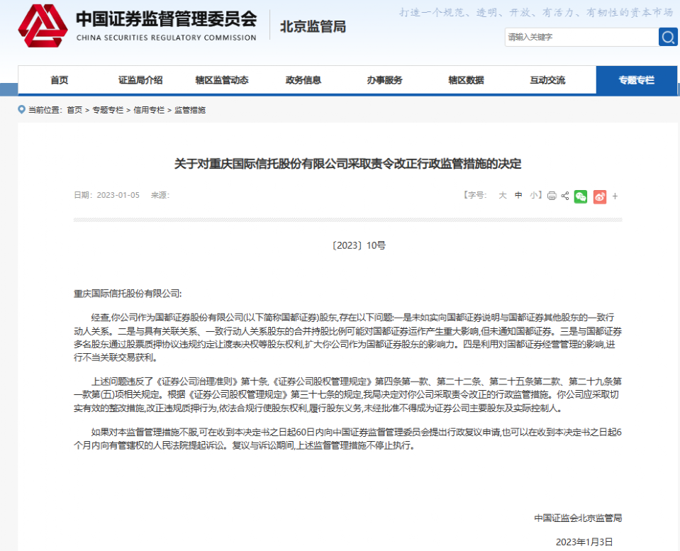 北京证监局指出,重庆国际信托作为国都证券股东,存在未如实说明一致行动人关系、与其他股东违规约定让渡股东权利、利用对国都证券经营管理影响进行不当关联交易获利等多方问题。