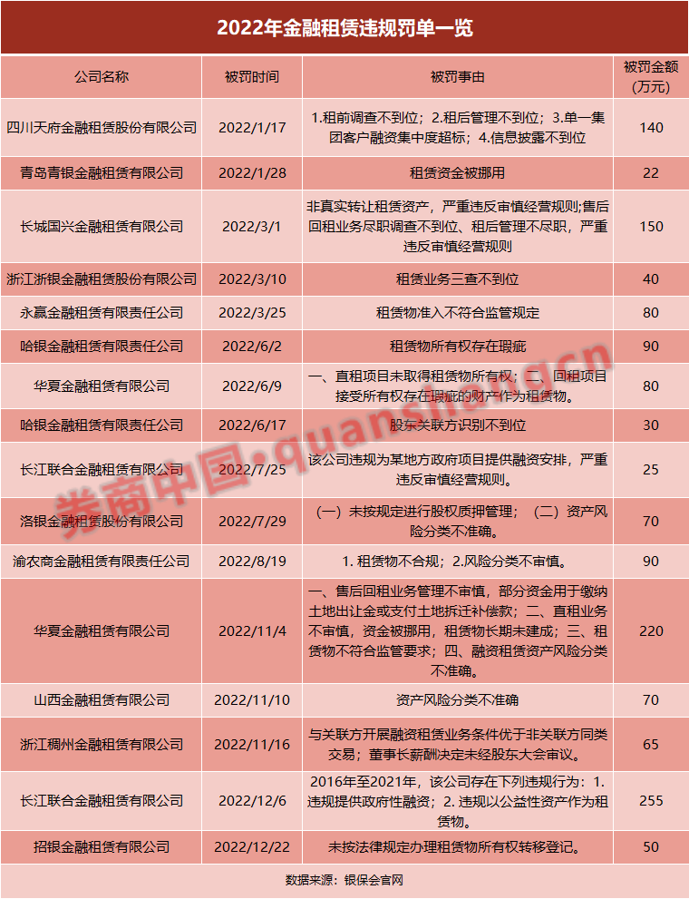 金融租赁行业监管趋严,部分金租公司因业务违规问题受到的处罚也在不断落地。记者据银保监会官网不完全统计,2022年共有13家金融租赁公司因不同类型的违法违规事由遭受处罚,合计被罚款1477万元,多人被处以警告,有人还遭受终身禁业。