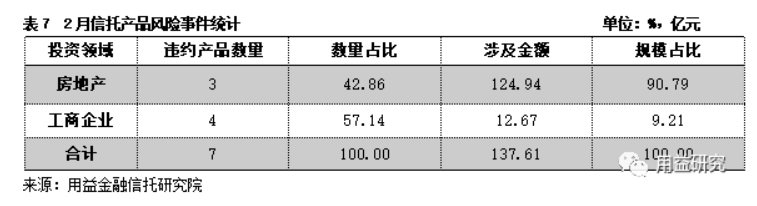 据公开资料不完全统计,2022年2月共发生信托产品违约事件7起,涉及金额137.61亿元。