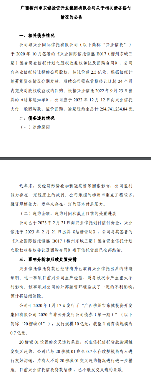 柳州东城已于2023年2月21日向兴业信托划付偿付资金,兴业信托于2023年2月21日出具《结清证明》,公司与其签署的《兴业国际信托恒盛 B017(柳州东城三期)集合资金信托计划之股权收益权转让及回购合同》项下信托贷款已全部结清。