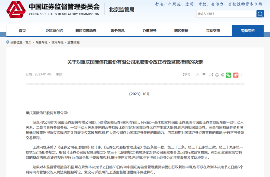 除重庆信托外,北京证监局还对国都证券其他5名小股东同样采取责令改正、警示函等行政监管措施,涉及事由为“向其他股东违规让渡表决权等股东权利”。