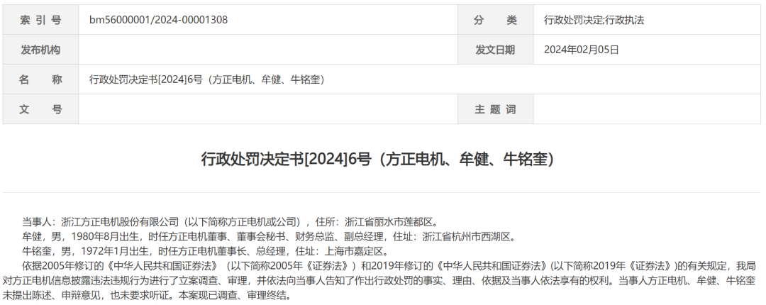 其实,今年2月5日,公司就已收到行政处罚决定书[2024]6号。浙江监管局表示,综合考虑方正电机连续5年年度报告存在虚假记载、个别年度虚假记载占比较大等情况,对浙江方正电机股份有限公司责令改正,给予警告,并处以400万元罚款;对方正电机时任董事、董事会秘书、财务总监、副总经理牟健给予警告,并处以130万元罚款;对方正电机时任董事长、总经理牛铭奎给予警告,并处以80万元罚款。
