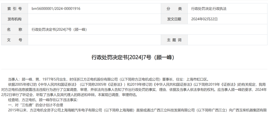 2月22日,浙江证监局发布行政处罚决定书[2024]7号,披露了方正电机(维权)连续5年年报造假的细节,此外,浙江证监局对公司时任董事长顾一峰给予警告,并处以70万元罚款。