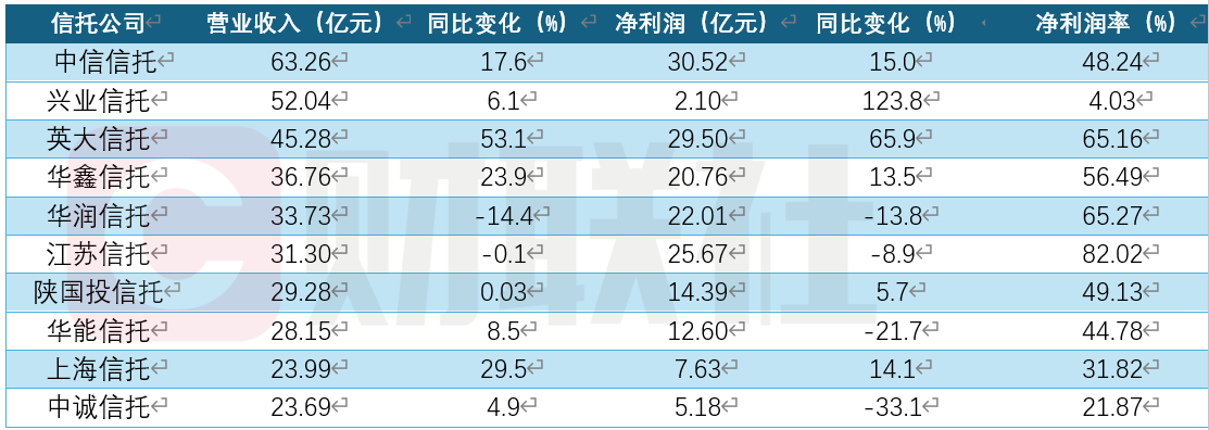同时,净利润规模达314.18亿元,同比增长14.23%。从增长覆盖面来看,在已披露财报的信托公司样本中,共有28家实现净利润正增长,占比56%。