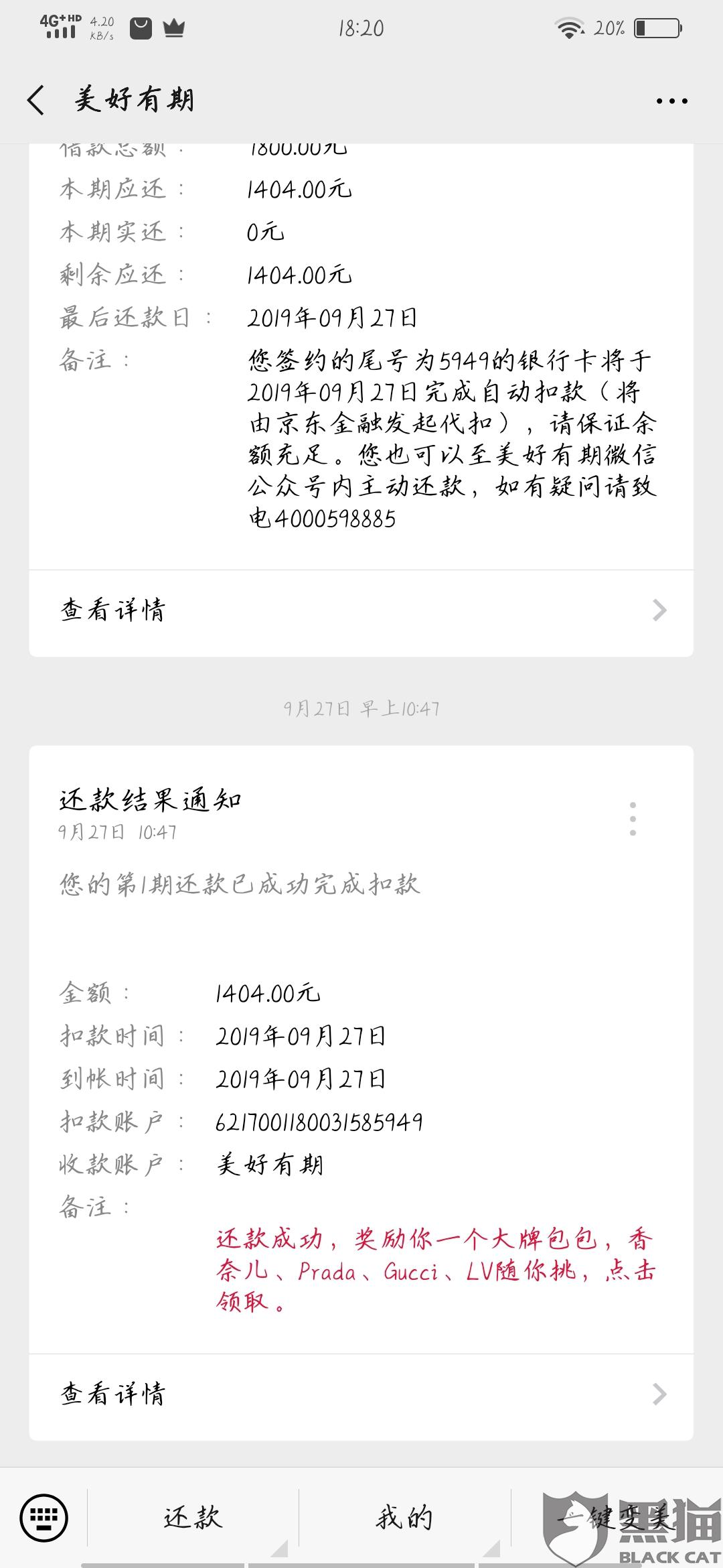 消费者“匿名”在9月30日向黑猫投诉平台再次反映:“就是这个分期 美好有期 她们给我分了6期 我现在已经还了一期 我要求她们把我分期取消”